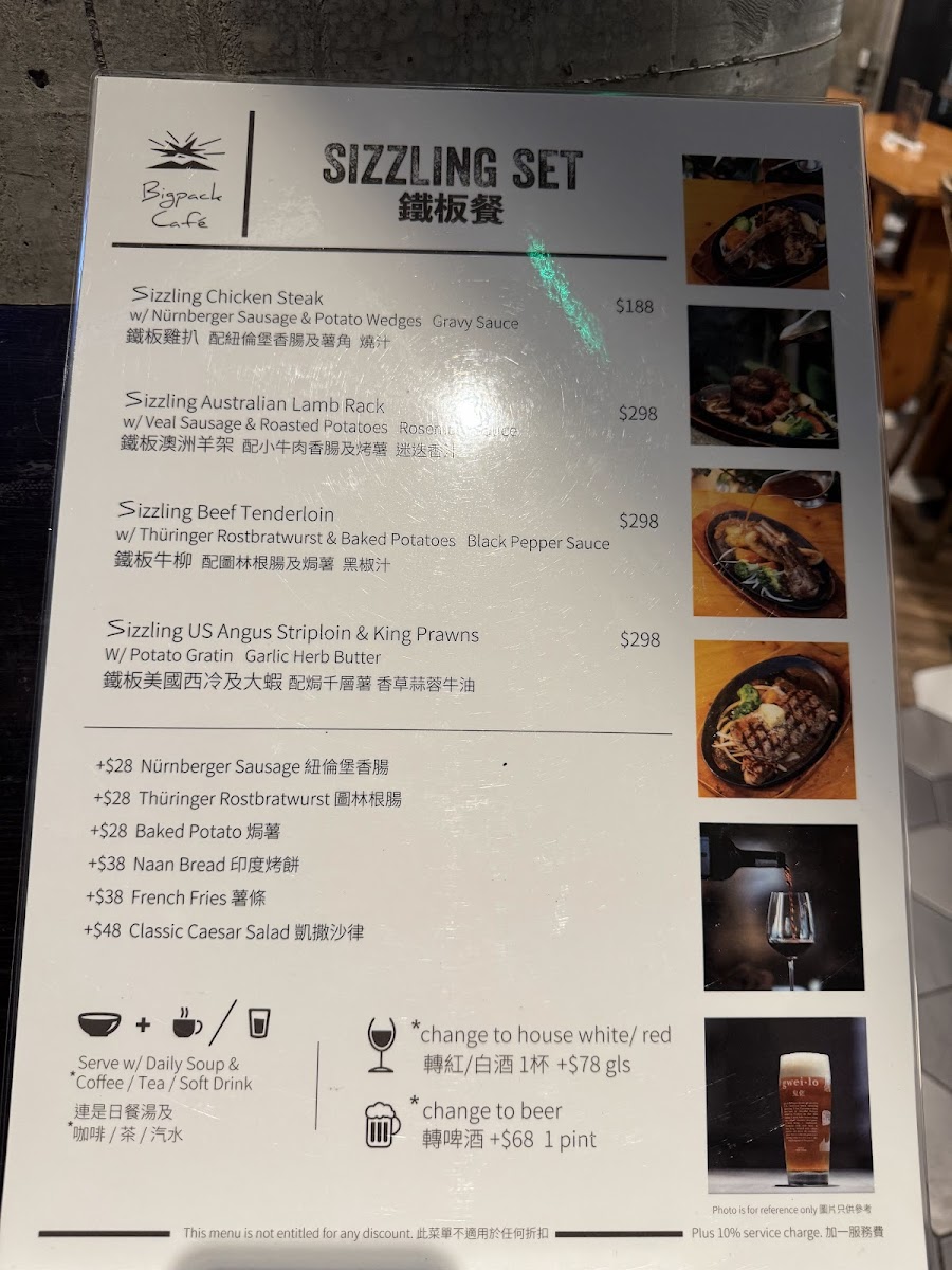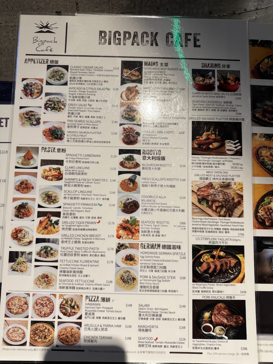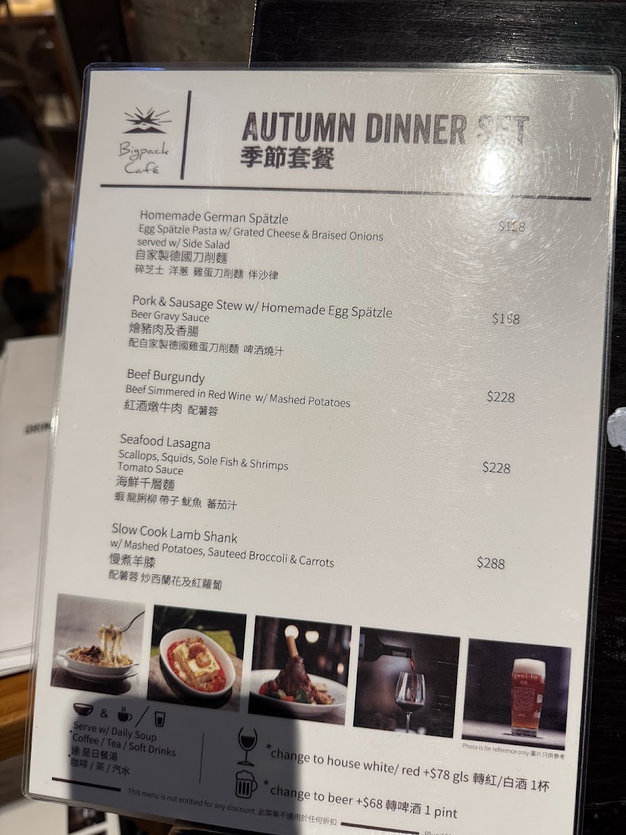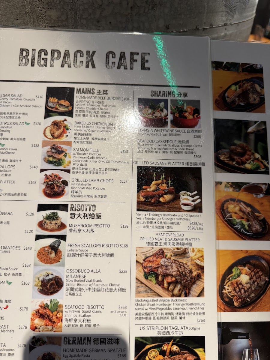 Bigpack Cafe at 215, THE FOREST, 17 Nelson Street in Mong Kok offers a menu that balances comforting classics with elevated café-style creations. The Coffee and Lavender Latte showcase the café’s attention to quality and flavor, while the selection of Draft Beer provides a refreshing complement for heartier dishes. Signature mains like the Braised Black Mussel and Beef Ribs are rich, savory, and perfectly seasoned, appealing to those seeking indulgent comfort food. For a more refined palate, the Port Braised Lamb Shank delivers tender, slow-cooked meat with deep, aromatic flavors, while the Linguine w Clams highlights a lighter, more delicate seafood option. Local favorites such as 豬扒 bring a satisfying, homestyle touch that pairs well with the café’s drinks menu. Overall, the offerings at Bigpack Cafe reflect a careful balance of approachable yet distinctive dishes, making it a versatile spot for both casual meals and special indulgences.